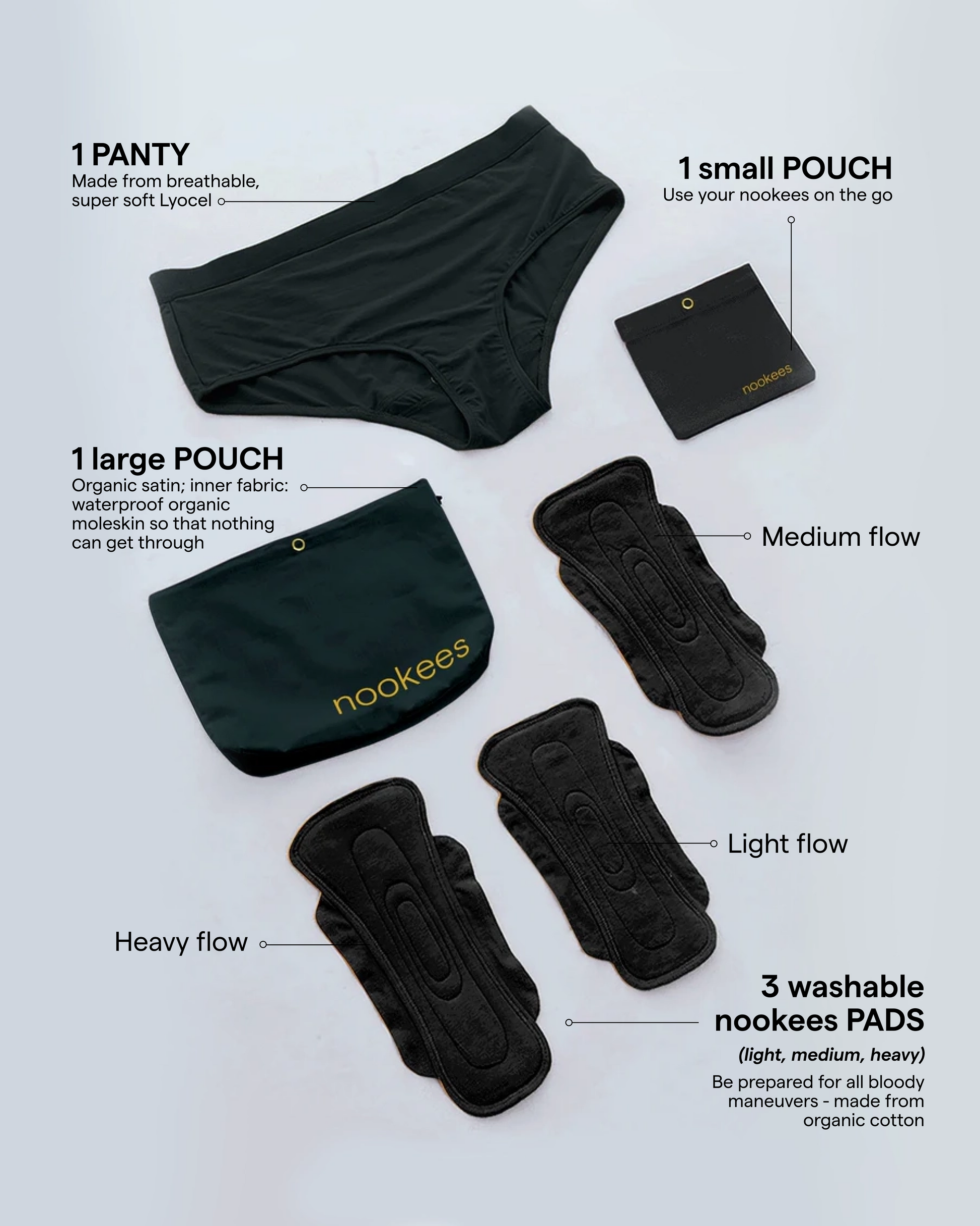 THE PAD and THE PANTY. nookees period underwear comes with two components. Double safety, double flexibility.